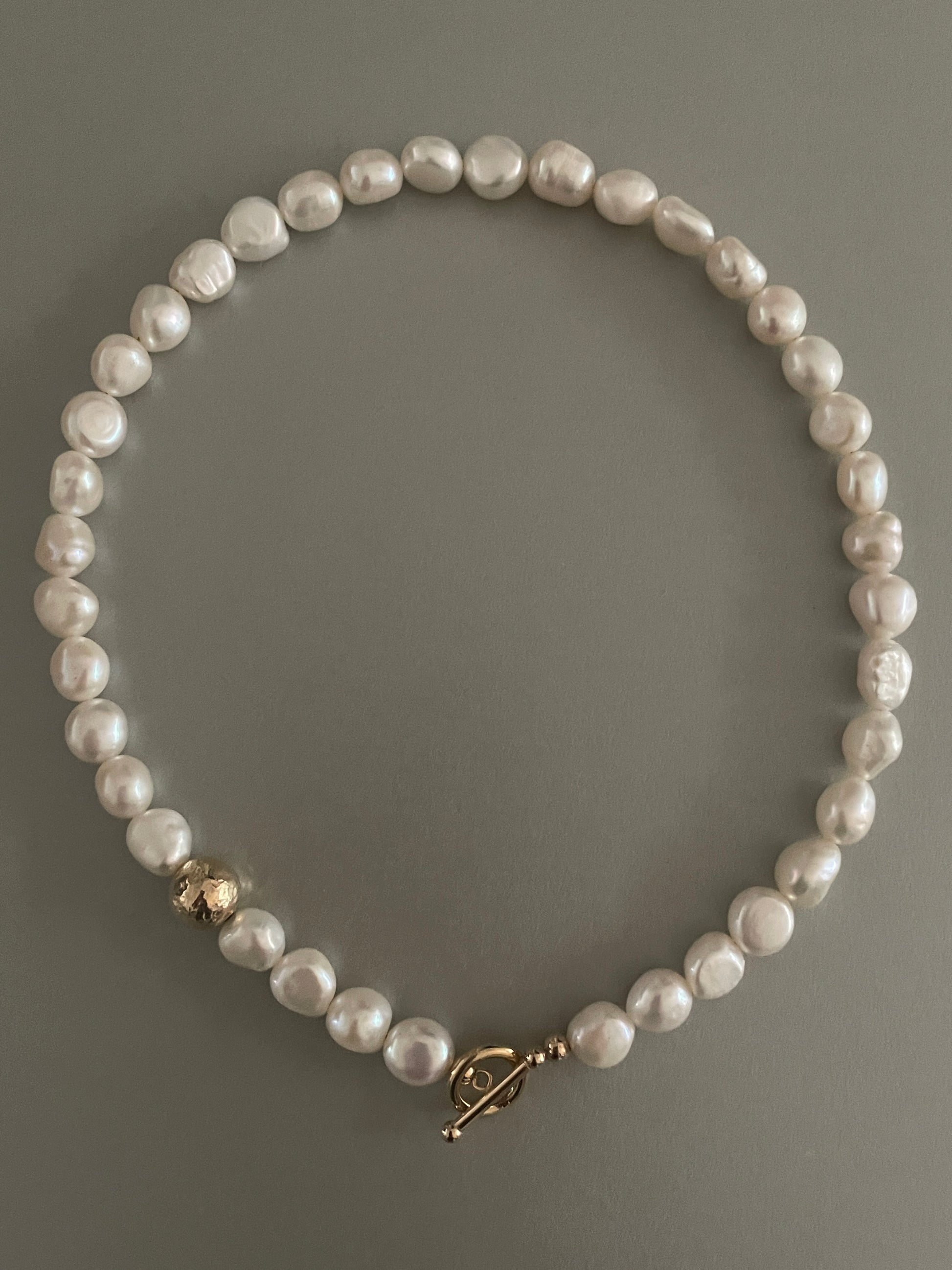 Deze elegante ketting is opgebouwd uit opvallend grote zoetwaterparels – elk uniek van vorm en met een schitterende natuurlijke glans. De ketting wordt subtiel geaccentueerd met een gold filled gouden bal en afgewerkt met een stevig, stijlvol gold filled slotje.